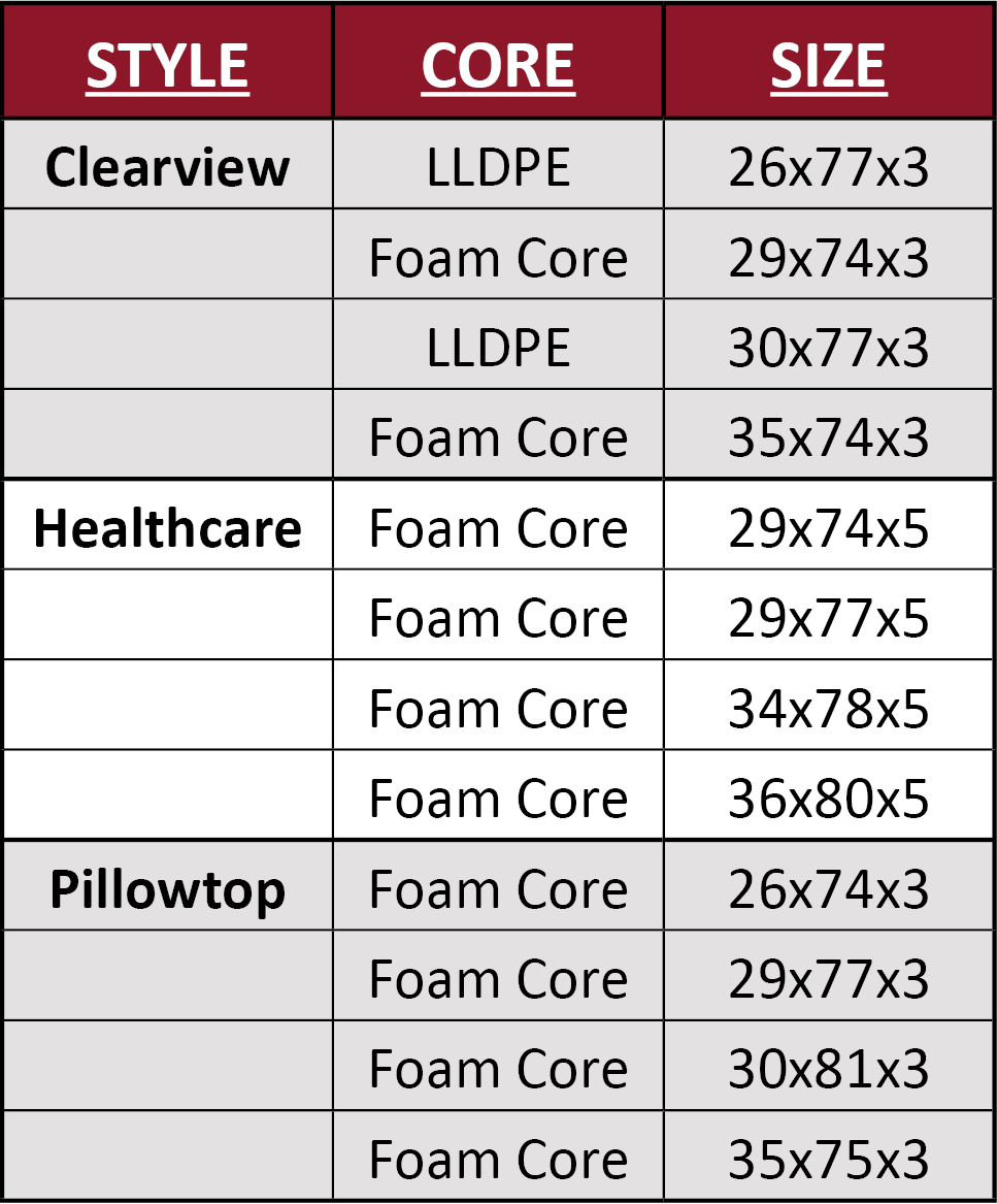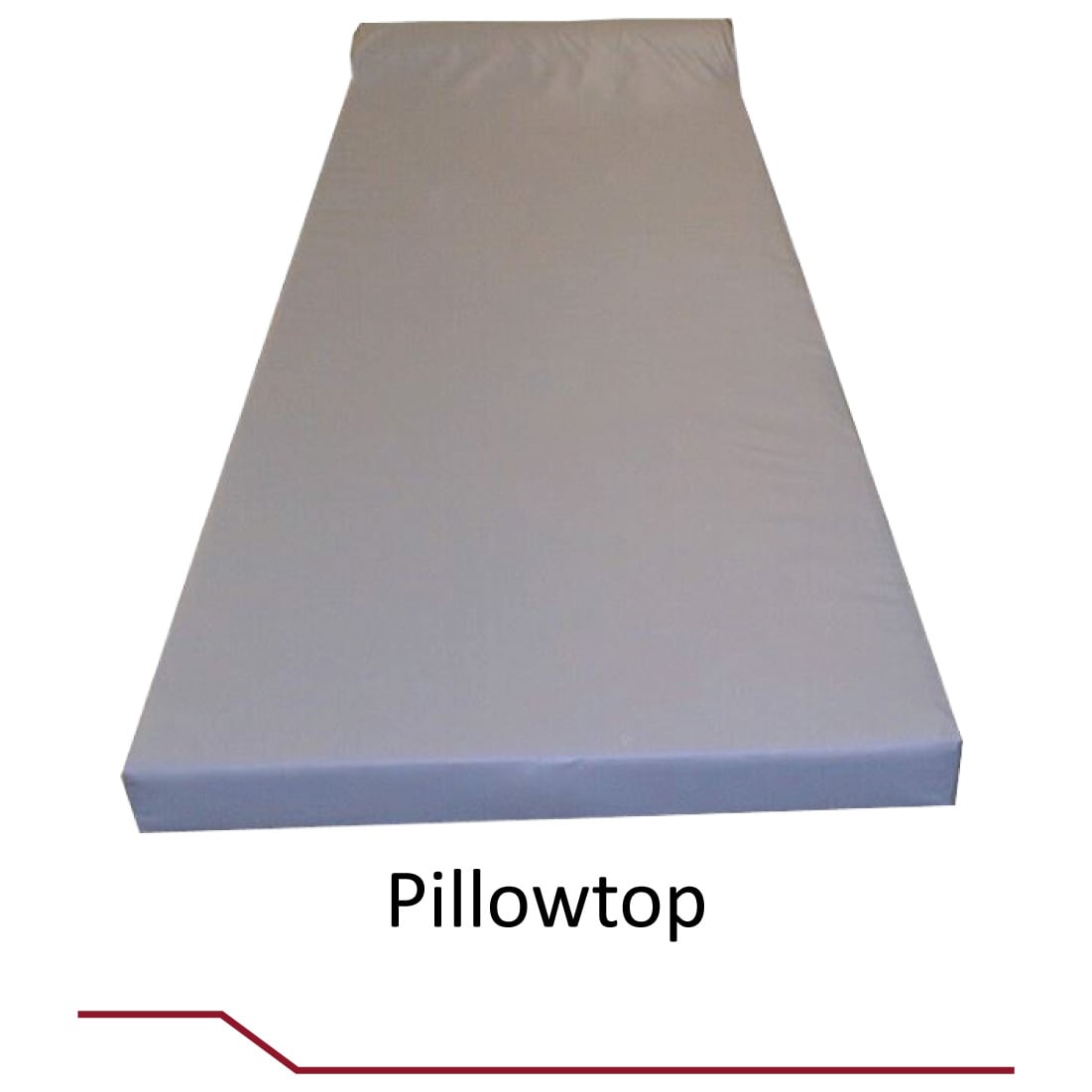 This mattress features a 3-inch, 1.8 lbs. density foam core with a built-in foam pillow bump at one end. It is covered in a PVC 4-ply, 2 substrate circular scrim vinyl ticking that is antimicrobial, and meets NFPA 701 flammability requirements.